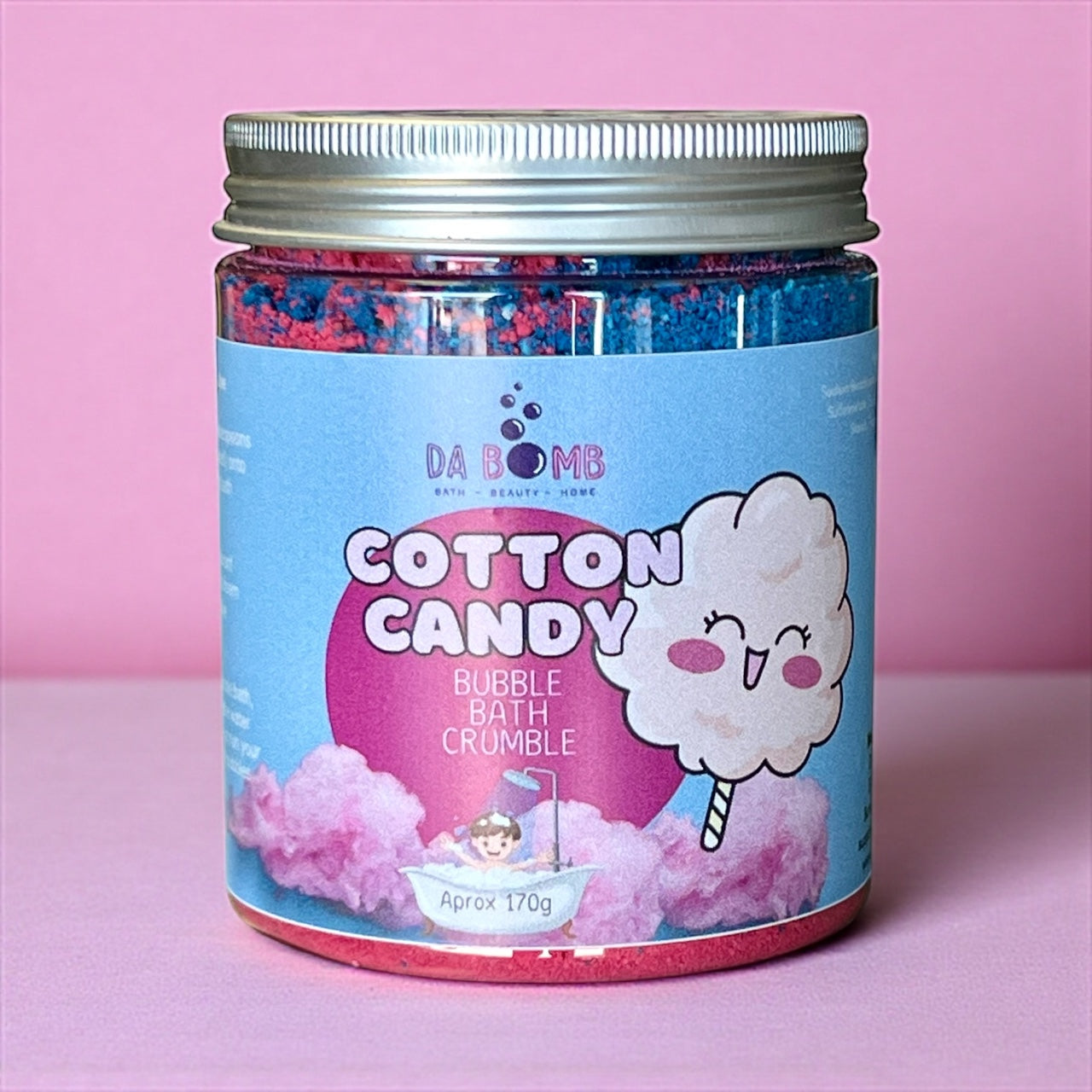 Turn bath time into a sweet, candy-coloured experience! This vibrant bubble bath crumble releases colourful swirls across the water’s surface, transforming your bath into a brightly coloured, bubbly wonderland. As the crumble dissolves, it fills the tub with the nostalgic scent of cotton candy and creates fluffy, fun bubbles when agitated — perfect for kids (and kids at heart)!
