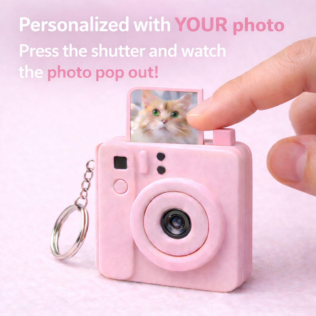 Our personalised camera keychain features a fun interactive shutter button — simply press it and your photo pops out, just like a real camera!