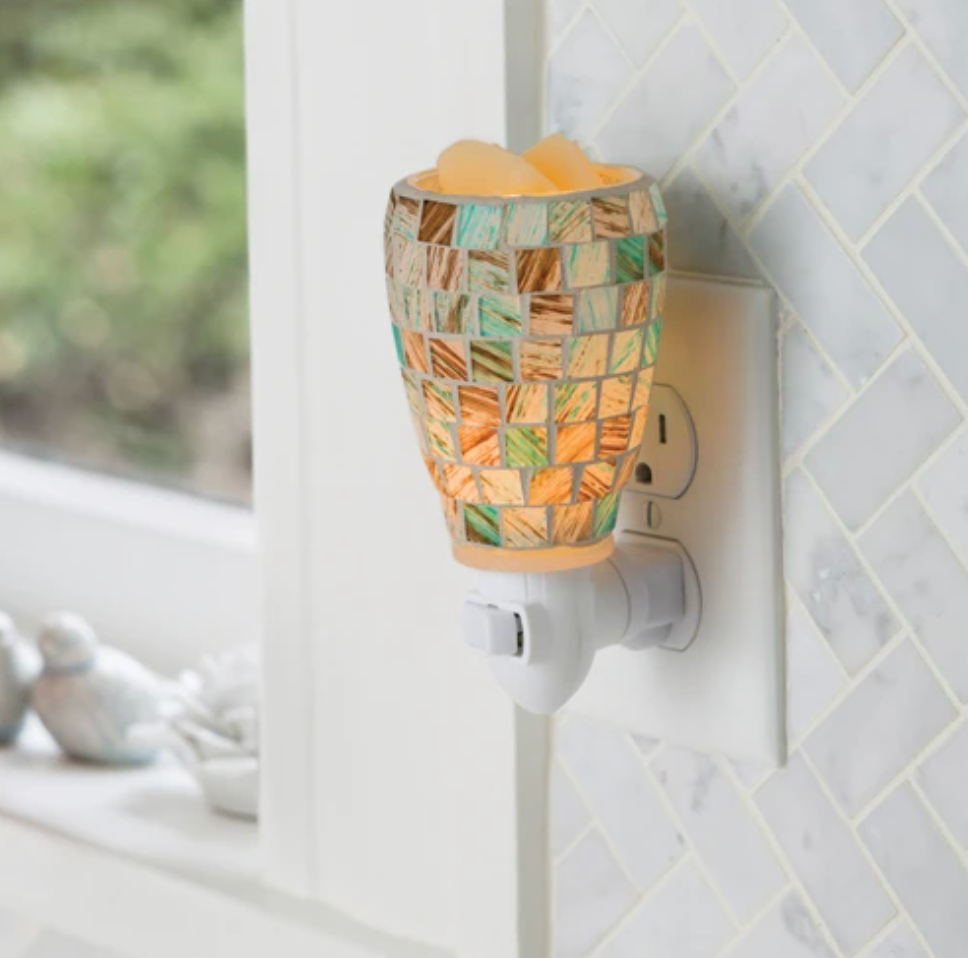 The Sea Glass Pluggable Warmer allows light to glow through square glass tiles in tones of natural browns and greens while an attached clear glass dish holds wax melts