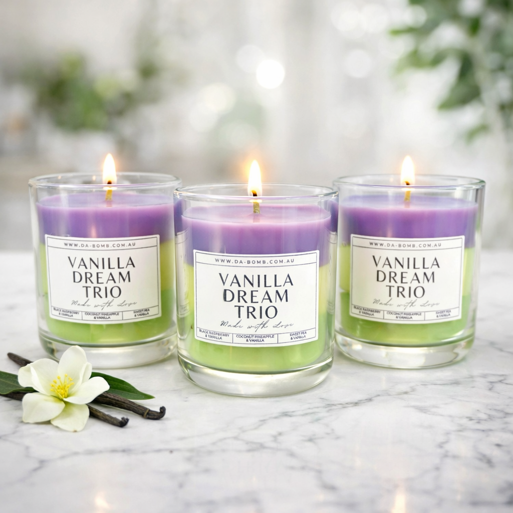 Indulge your senses with the Vanilla Dream Trio, a luxurious triple-layered candle designed to take you on a fragrant journey. Each layer unveils a unique and enchanting blend: